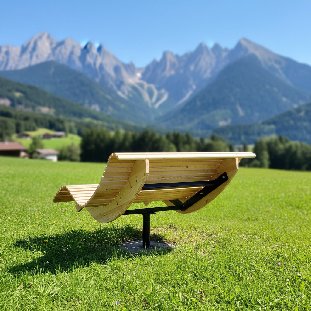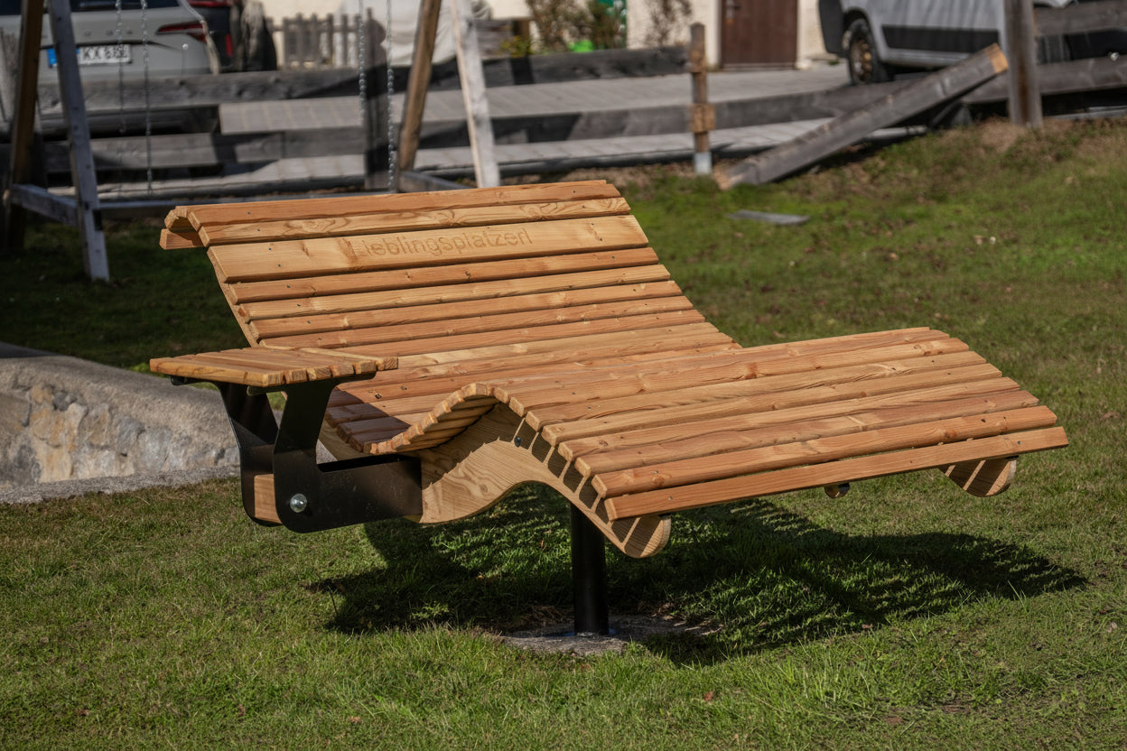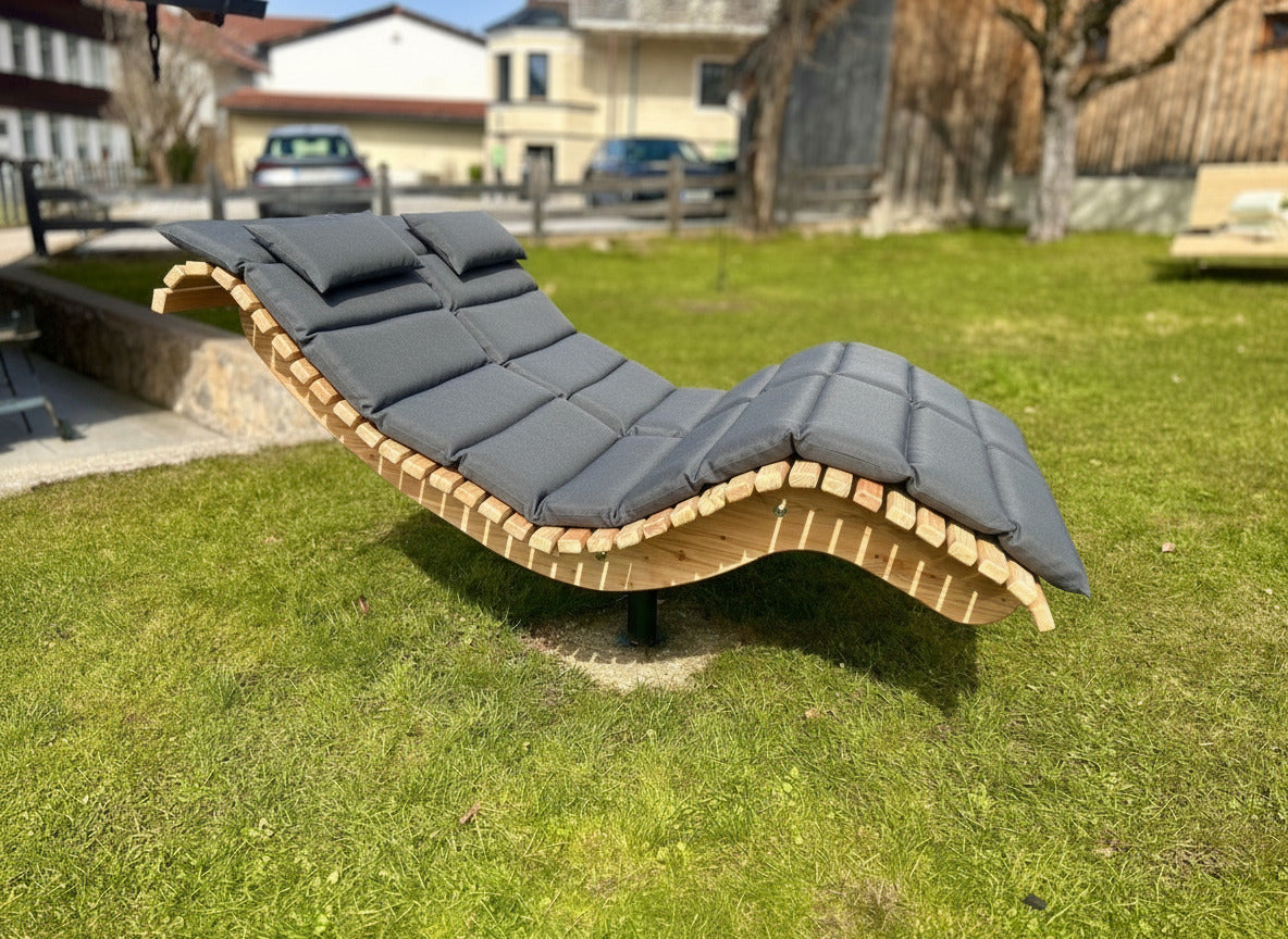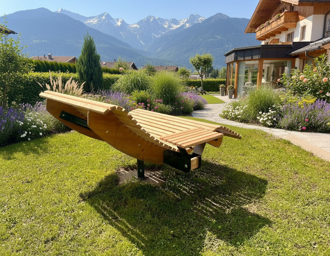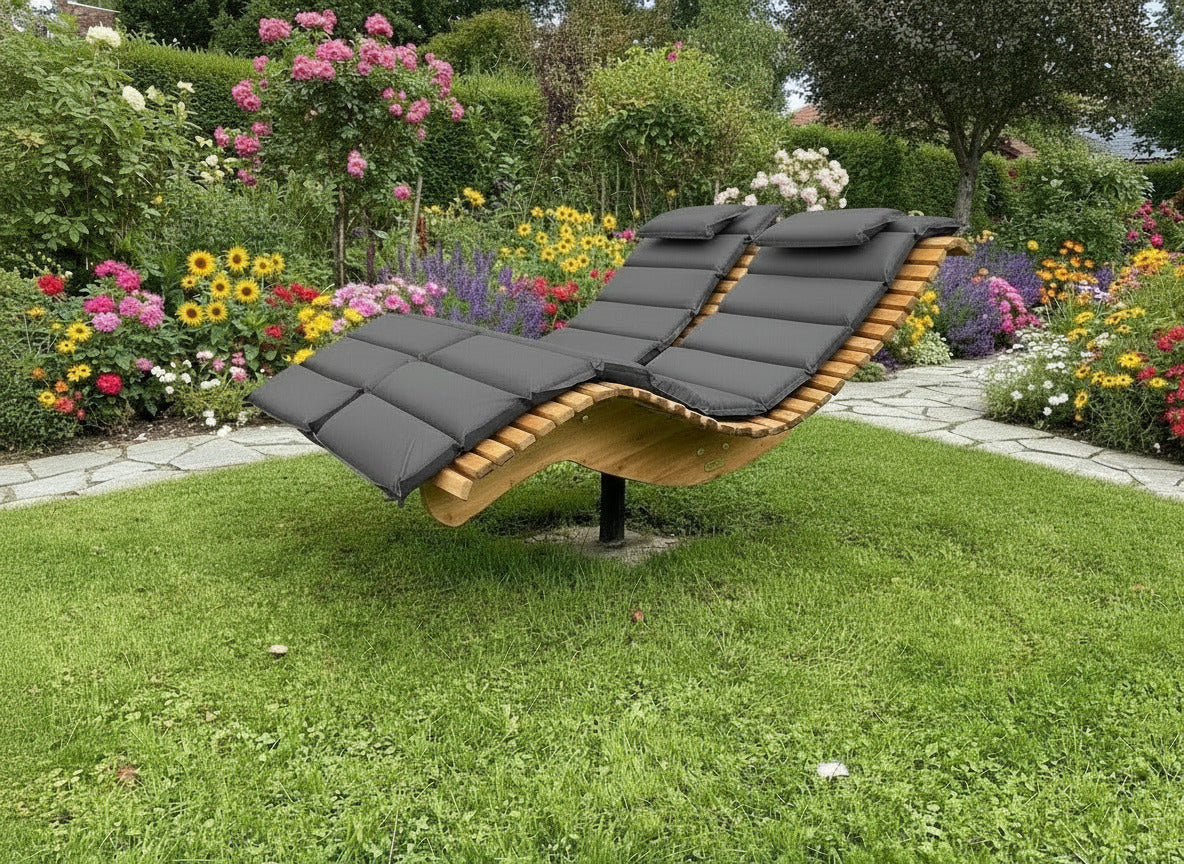Die Premium-Doppelliege "Walchensee" vereint innovative Funktionalität mit durchdachtem Design. Das 360°-drehbare Gestell ermöglicht endlose Rotationsbewegungen und wird durch einen integrierten Feststellgriff präzise kontrolliert – ideal für flexible Sonnenpositionierung ohne ständige Neuausrichtung. Die geschwungene Liegeform folgt der natürlichen Körperkontur und garantiert optimalen Liegekomfort über längere Zeiträume hinweg. Konstruktiv überzeugt die Liege durch großzügigen Freiraum unterhalb der Sitzfläche – Rasenmähen und Gartenarbeiten sind problemlos möglich, ohne die Liege zu verschieben.