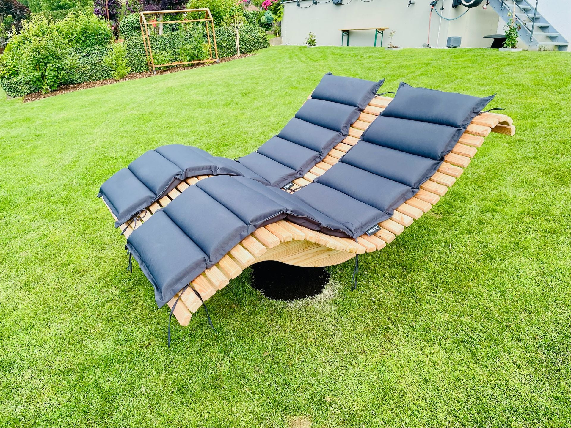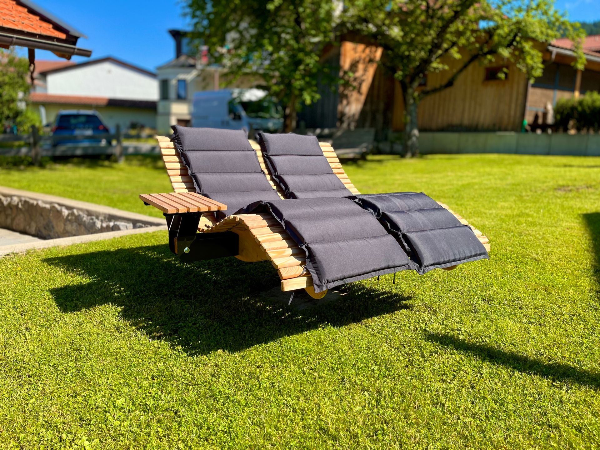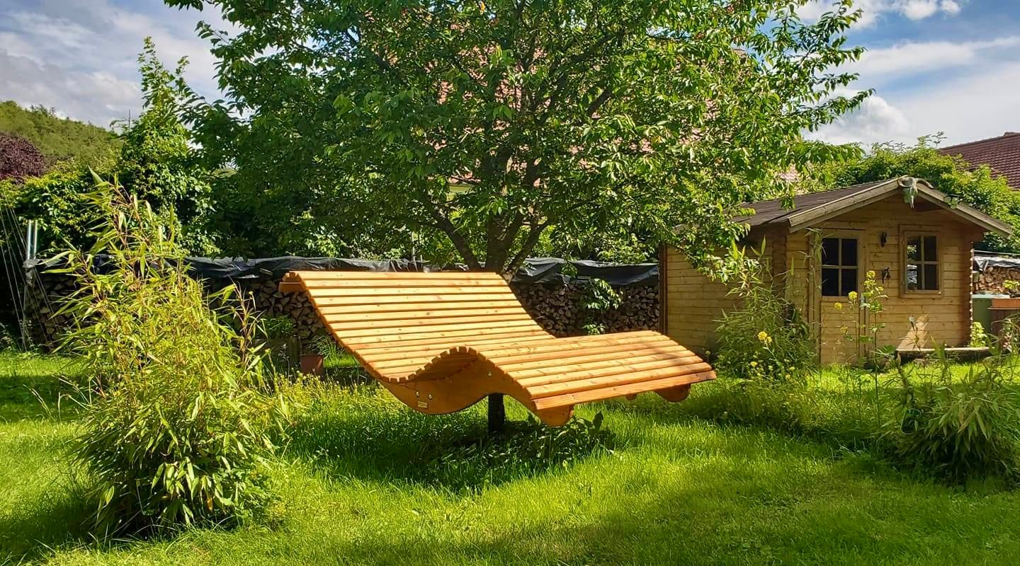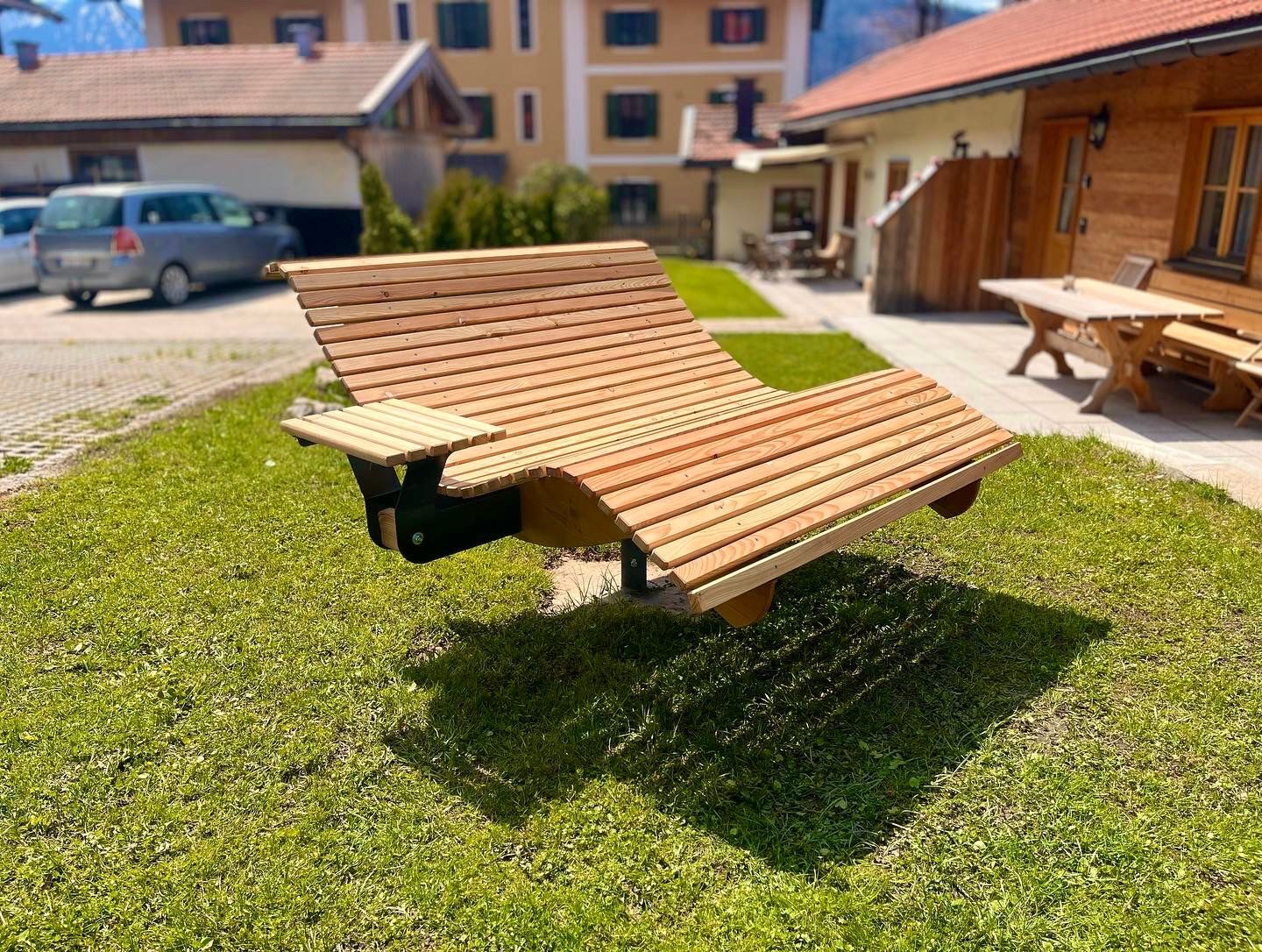 Die Premium-Doppelliege "Walchensee" vereint innovative Funktionalität mit durchdachtem Design. Das 360°-drehbare Gestell ermöglicht endlose Rotationsbewegungen und wird durch einen integrierten Feststellgriff präzise kontrolliert – ideal für flexible Sonnenpositionierung ohne ständige Neuausrichtung. Die geschwungene Liegeform folgt der natürlichen Körperkontur und garantiert optimalen Liegekomfort über längere Zeiträume hinweg. Konstruktiv überzeugt die Liege durch großzügigen Freiraum unterhalb der Sitzfläche – Rasenmähen und Gartenarbeiten sind problemlos möglich, ohne die Liege zu verschieben.