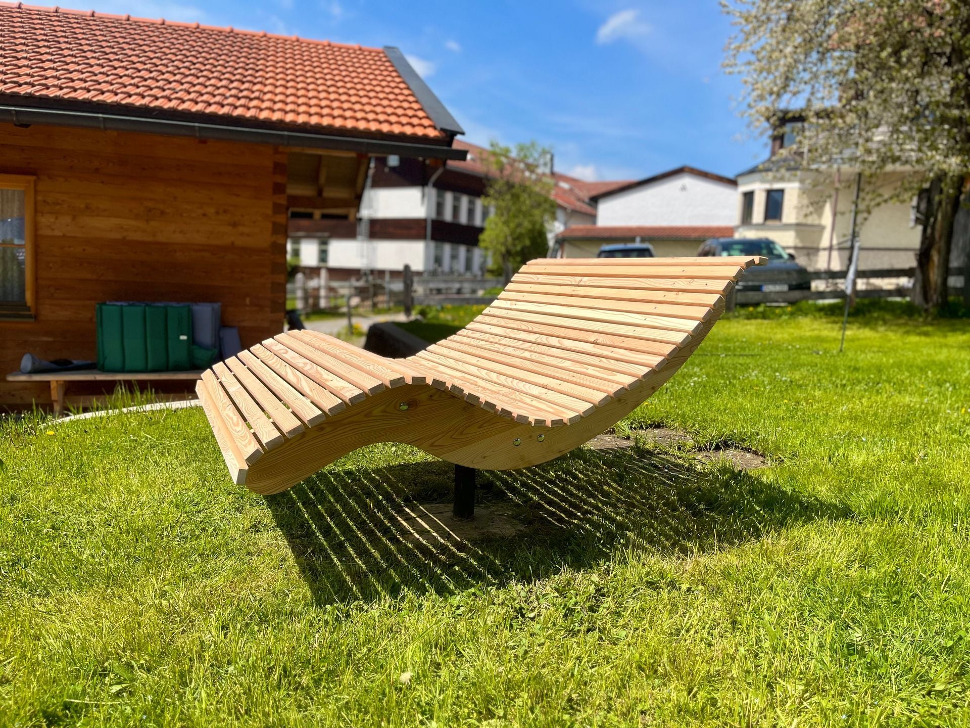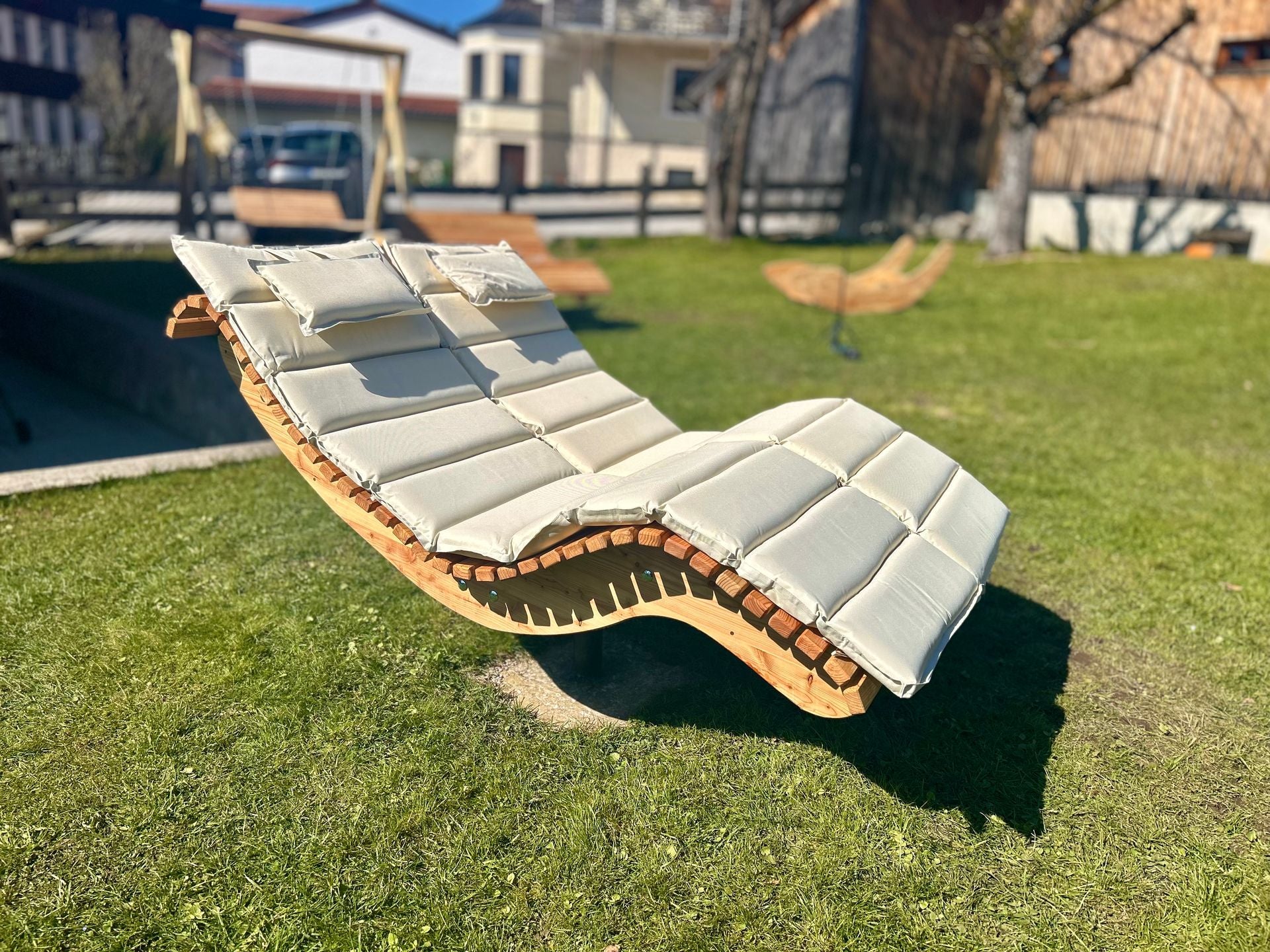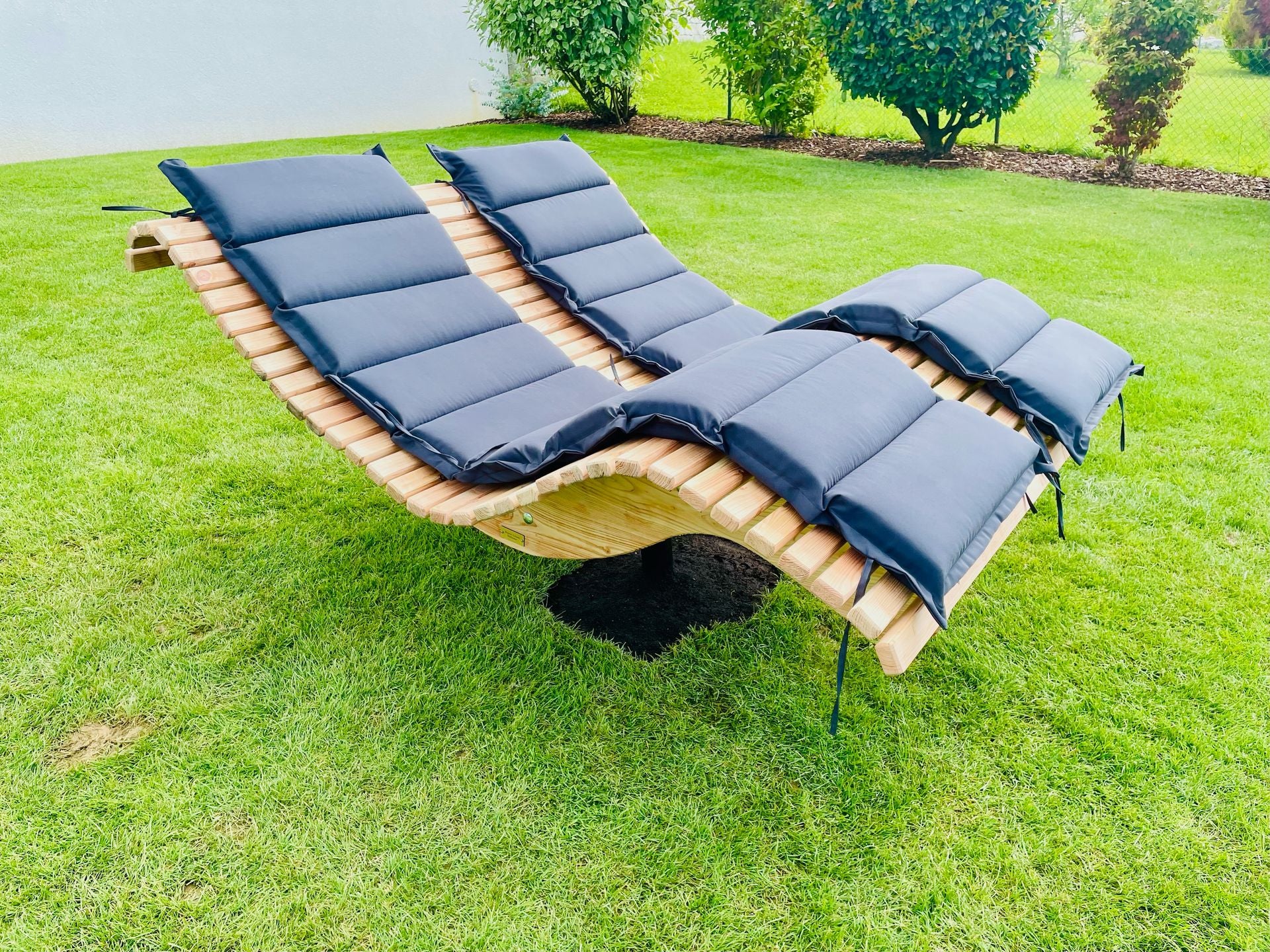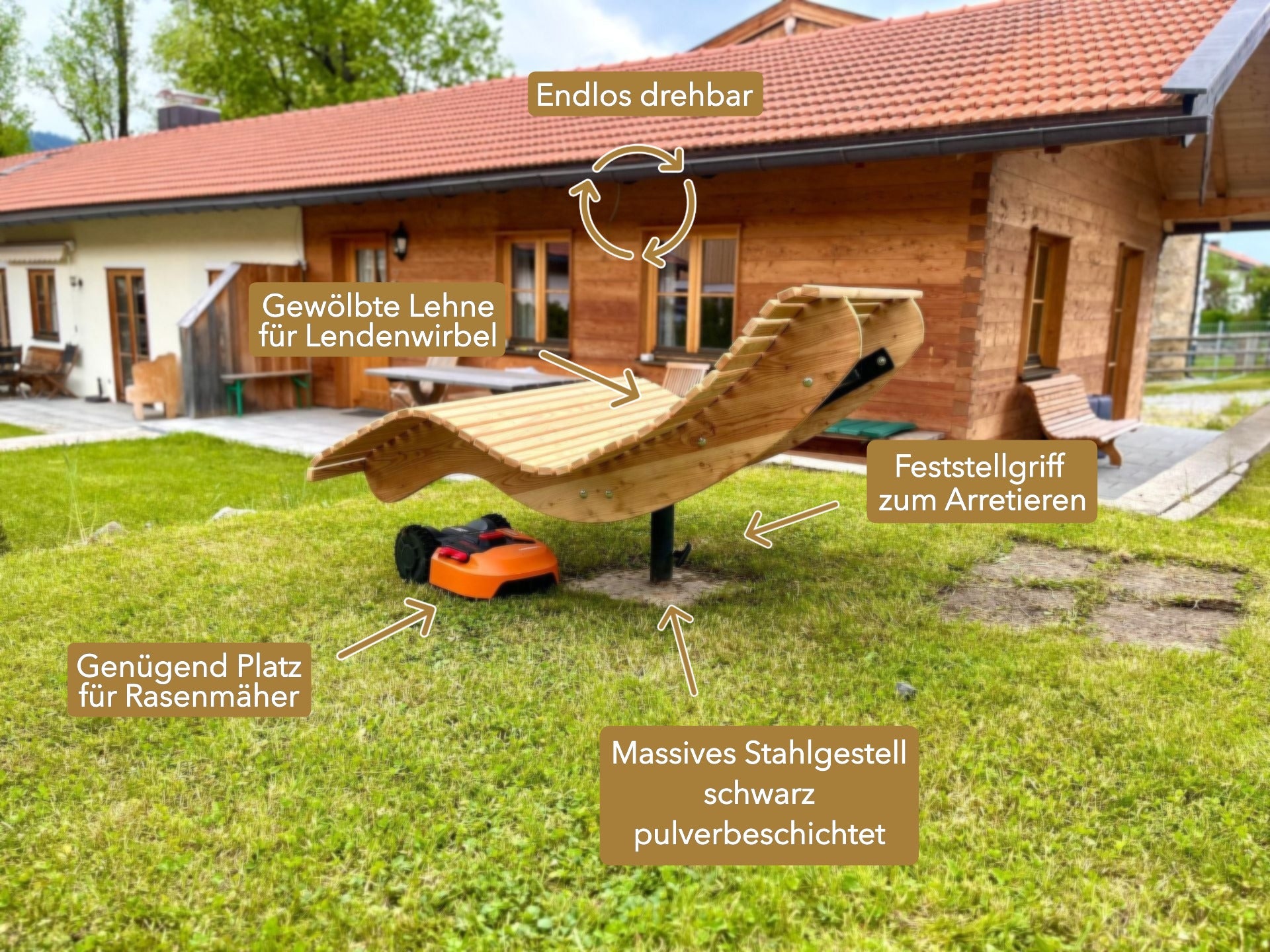 Die Premium-Doppelliege "Walchensee" vereint innovative Funktionalität mit durchdachtem Design. Das 360°-drehbare Gestell ermöglicht endlose Rotationsbewegungen und wird durch einen integrierten Feststellgriff präzise kontrolliert – ideal für flexible Sonnenpositionierung ohne ständige Neuausrichtung. Die geschwungene Liegeform folgt der natürlichen Körperkontur und garantiert optimalen Liegekomfort über längere Zeiträume hinweg. Konstruktiv überzeugt die Liege durch großzügigen Freiraum unterhalb der Sitzfläche – Rasenmähen und Gartenarbeiten sind problemlos möglich, ohne die Liege zu verschieben.