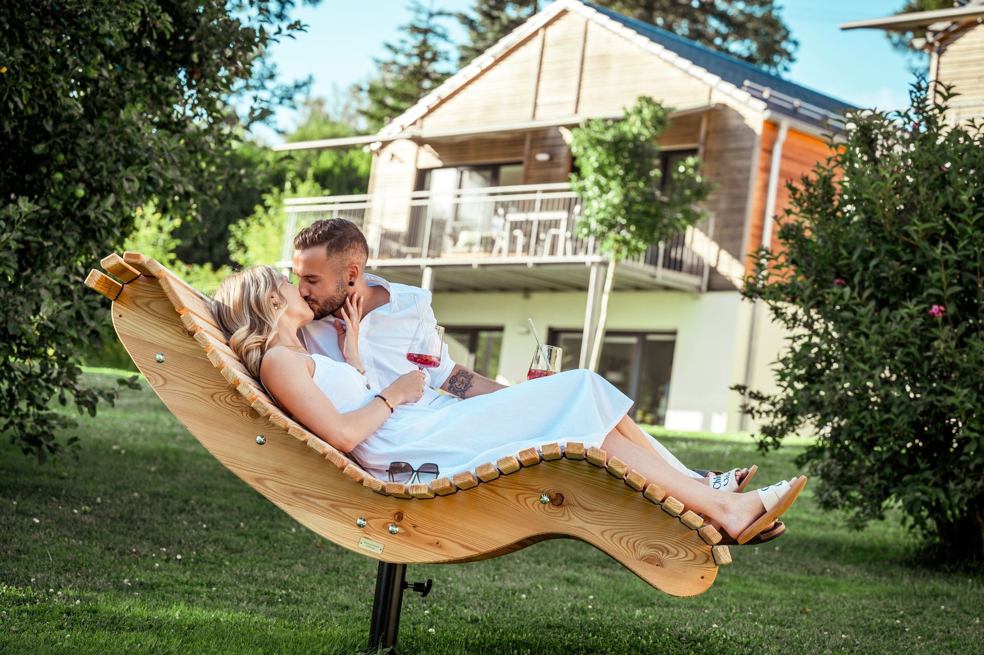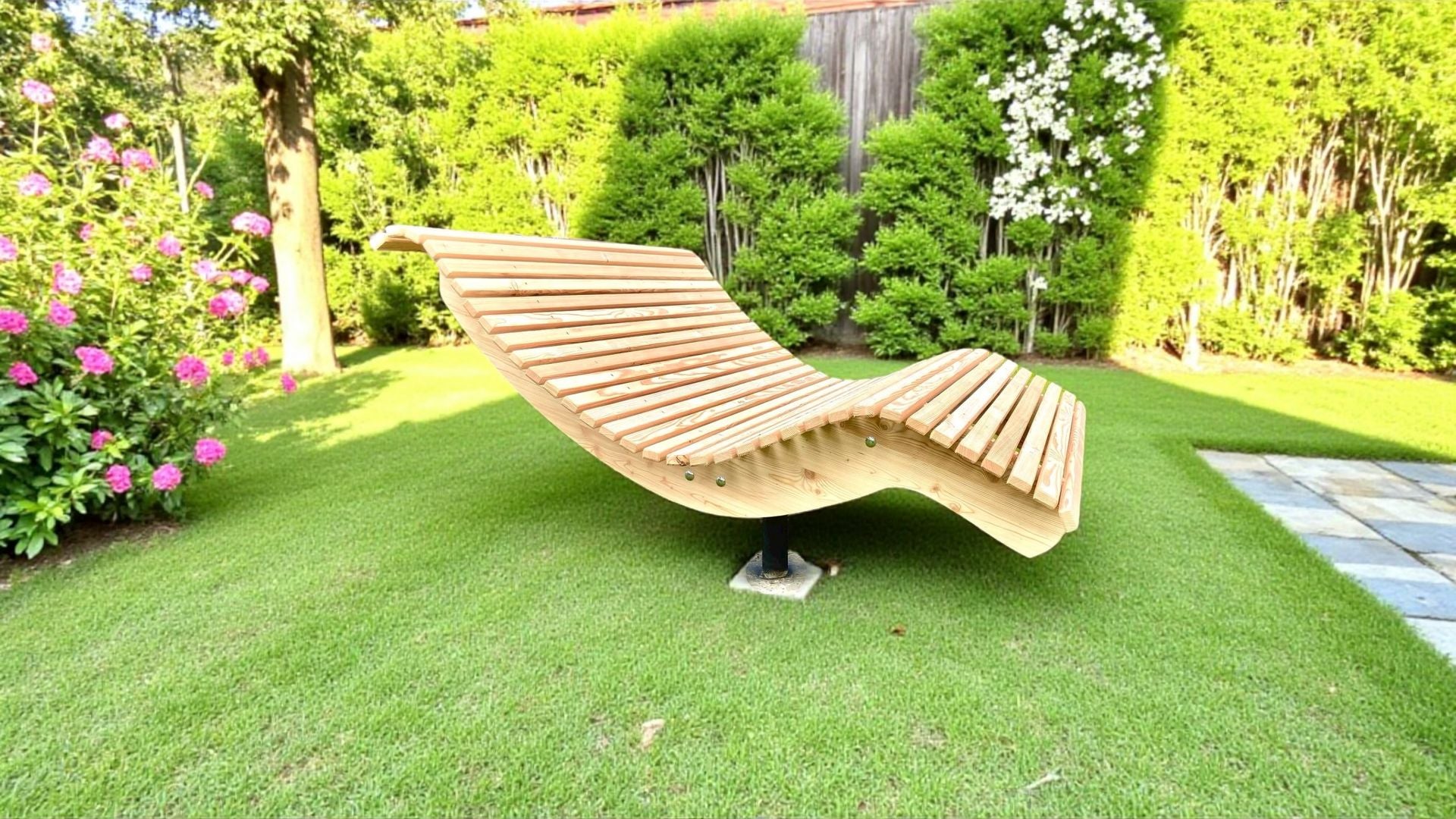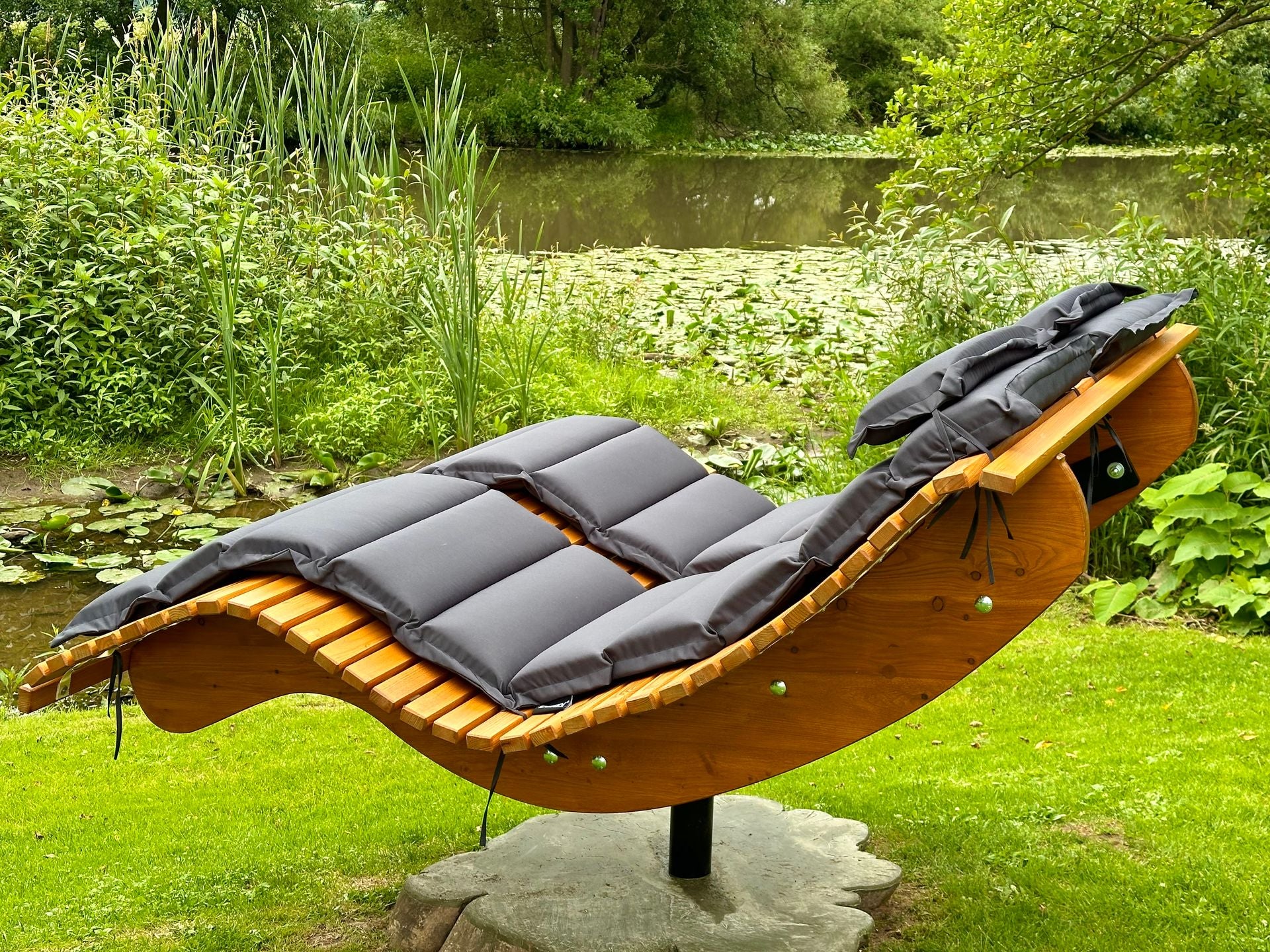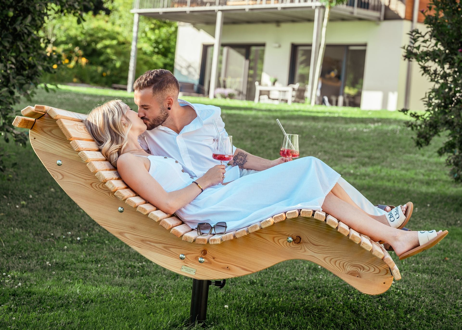 Die Premium-Doppelliege "Walchensee" vereint innovative Funktionalität mit durchdachtem Design. Das 360°-drehbare Gestell ermöglicht endlose Rotationsbewegungen und wird durch einen integrierten Feststellgriff präzise kontrolliert – ideal für flexible Sonnenpositionierung ohne ständige Neuausrichtung. Die geschwungene Liegeform folgt der natürlichen Körperkontur und garantiert optimalen Liegekomfort über längere Zeiträume hinweg. Konstruktiv überzeugt die Liege durch großzügigen Freiraum unterhalb der Sitzfläche – Rasenmähen und Gartenarbeiten sind problemlos möglich, ohne die Liege zu verschieben.