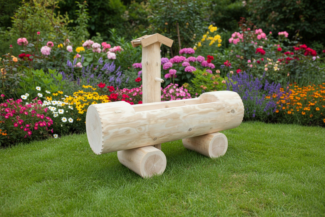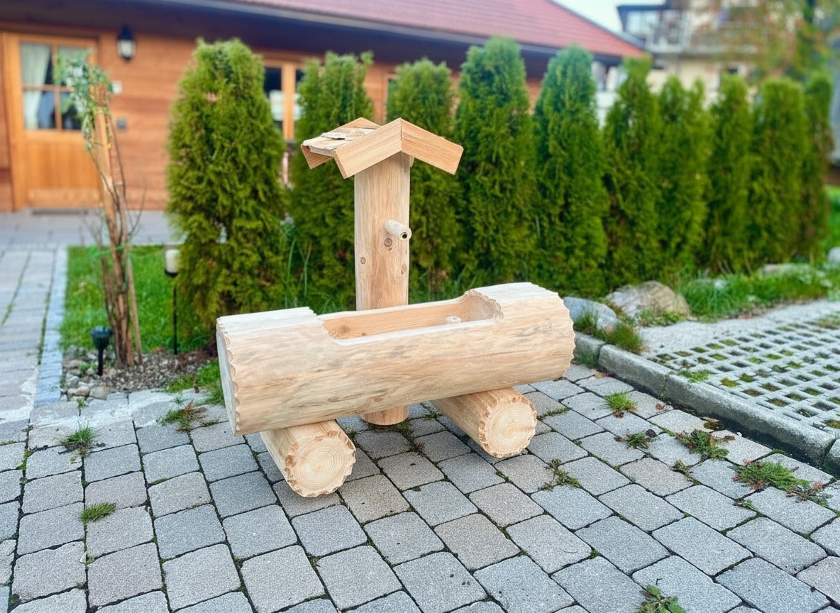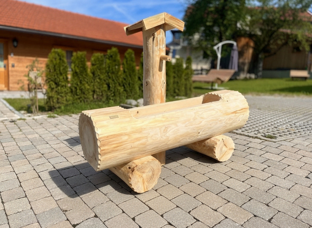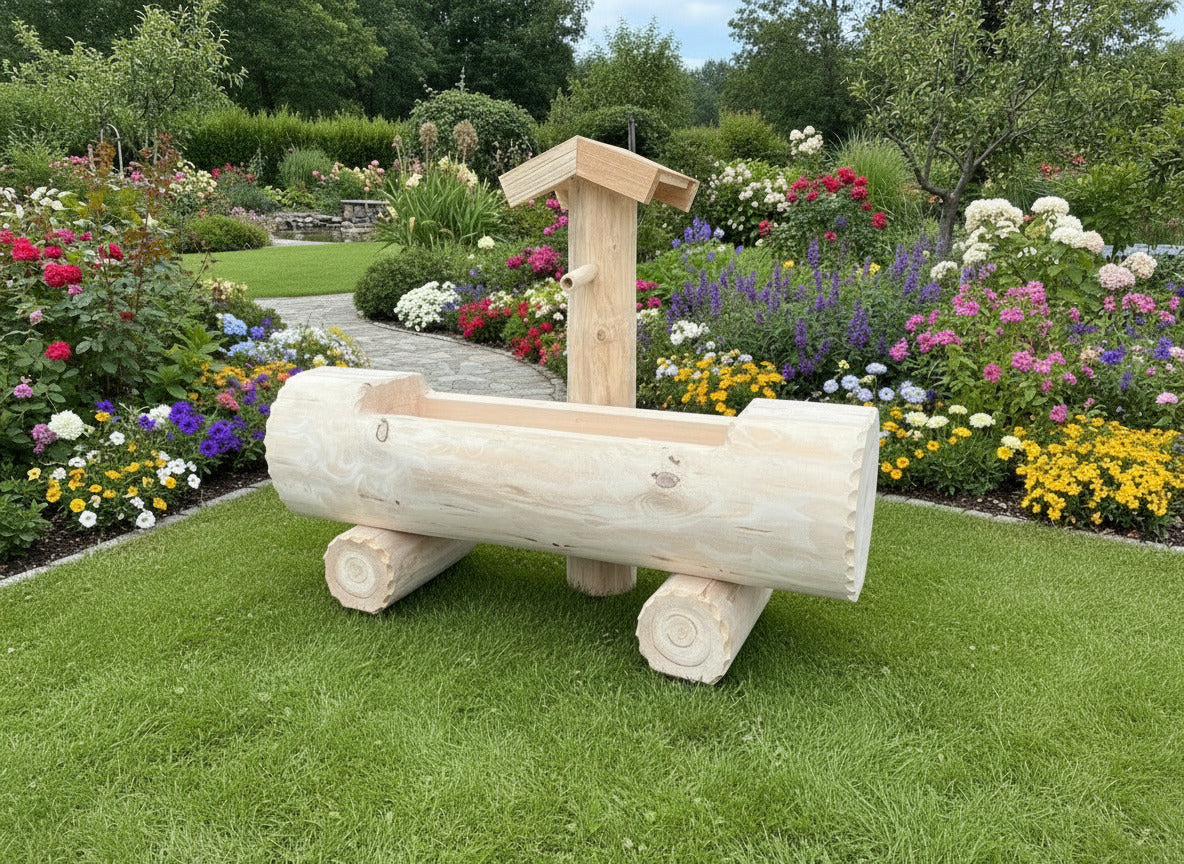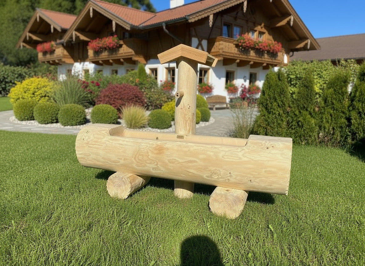 Authentischer bayerischer Holzbrunnen aus massivem Tannenholz mit geschliffener Oberfläche und zentraler Säule unter klassischem Lärchenholz-Schindeldach. Die seitlich abgeflachten Trogränder schaffen praktische Ablageflächen – ideal zum Abstellen von Blumentöpfen oder als komfortable Sitzkante. Die durchdachte Konstruktion verbindet regionale Handwerkskunst mit alltäglicher Funktionalität und macht den Brunnen zum vielseitigen Gestaltungselement für Gärten und Terrassen