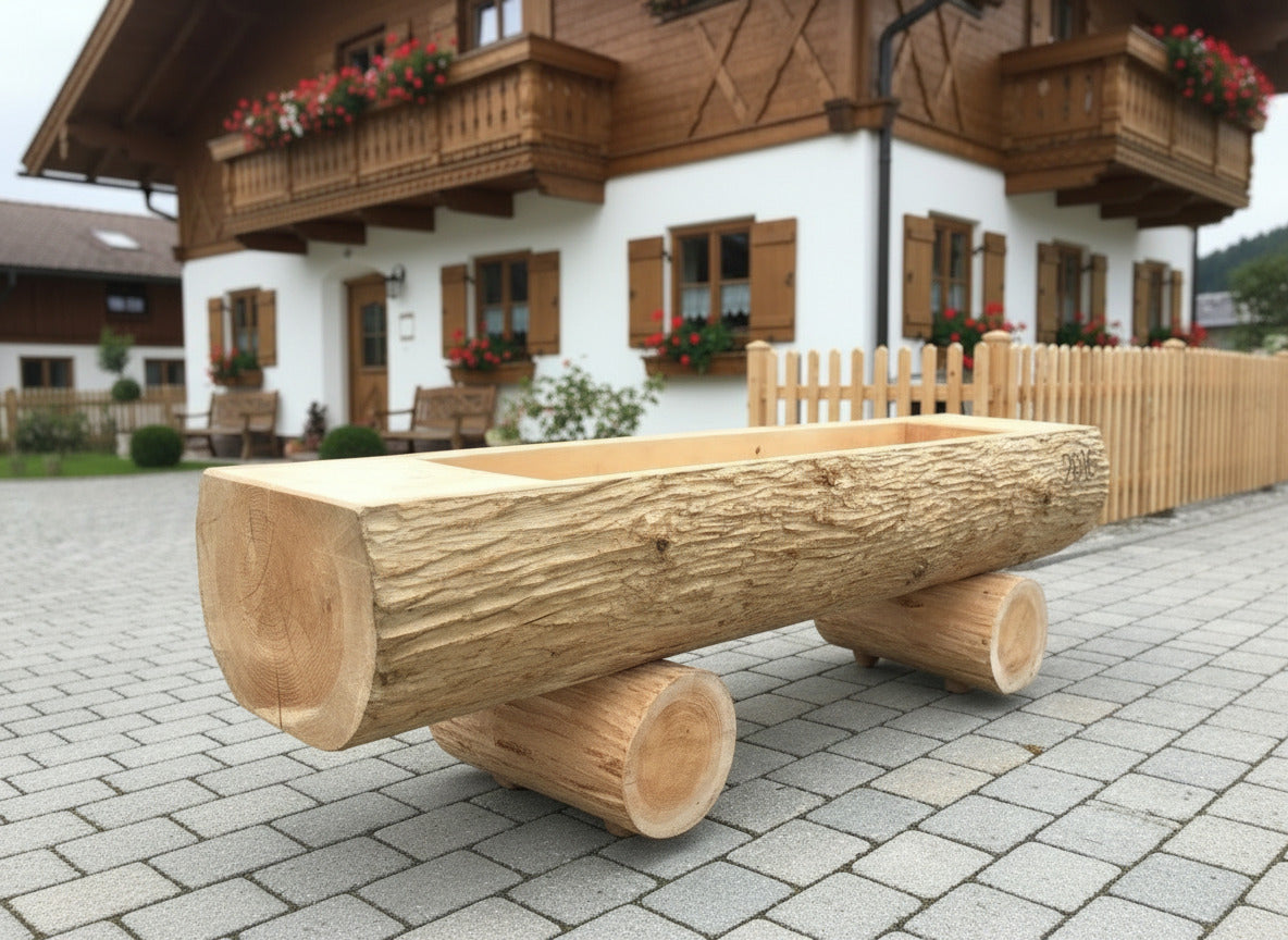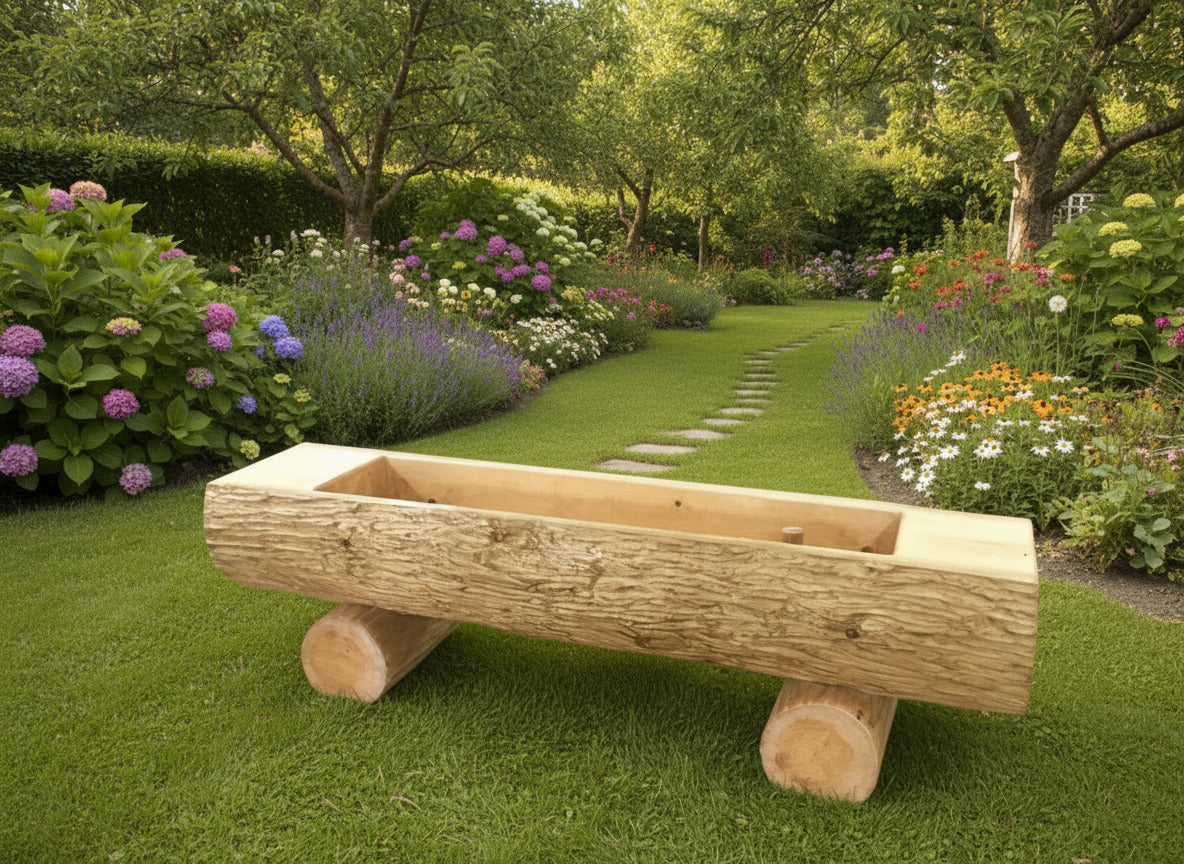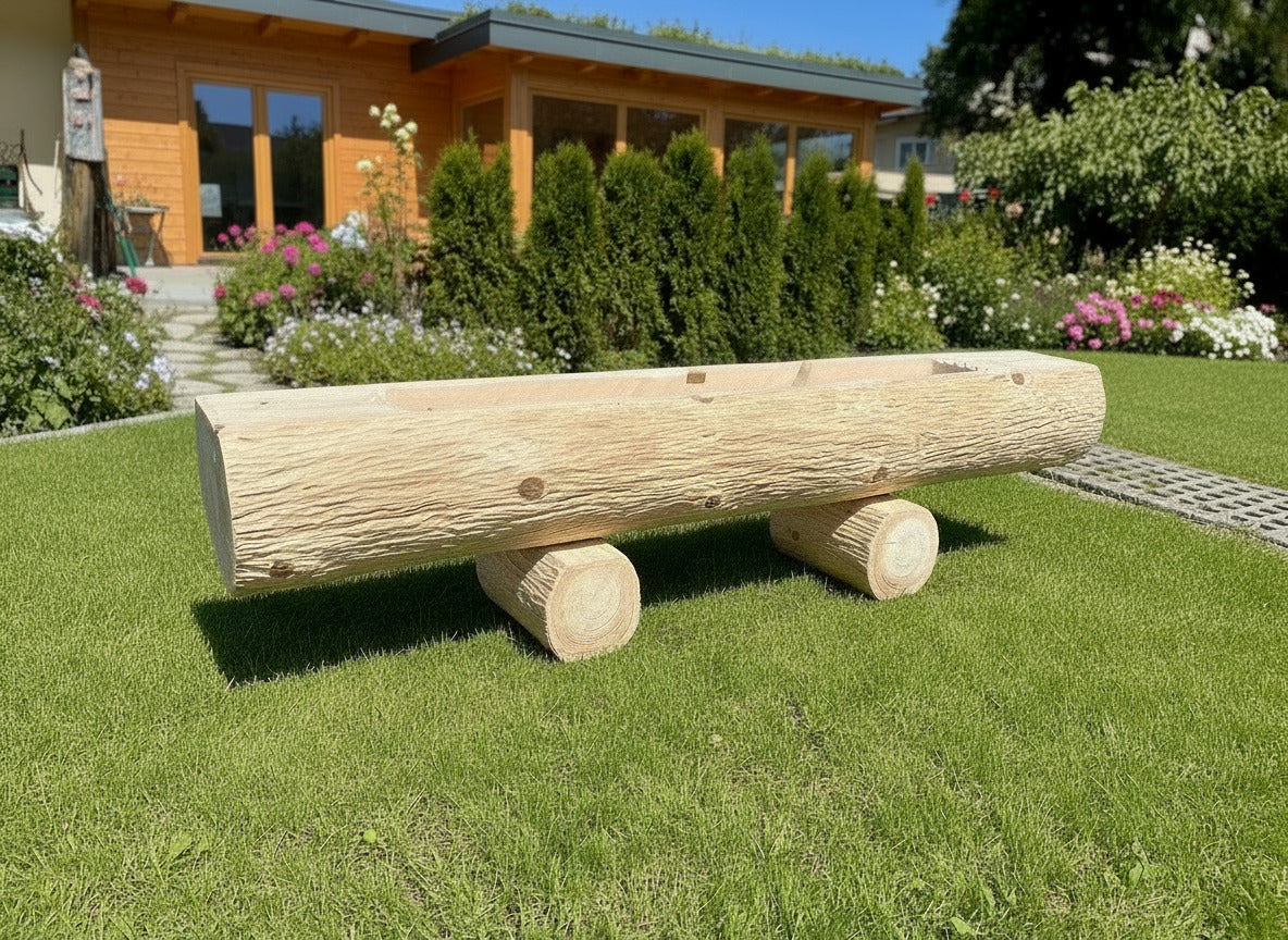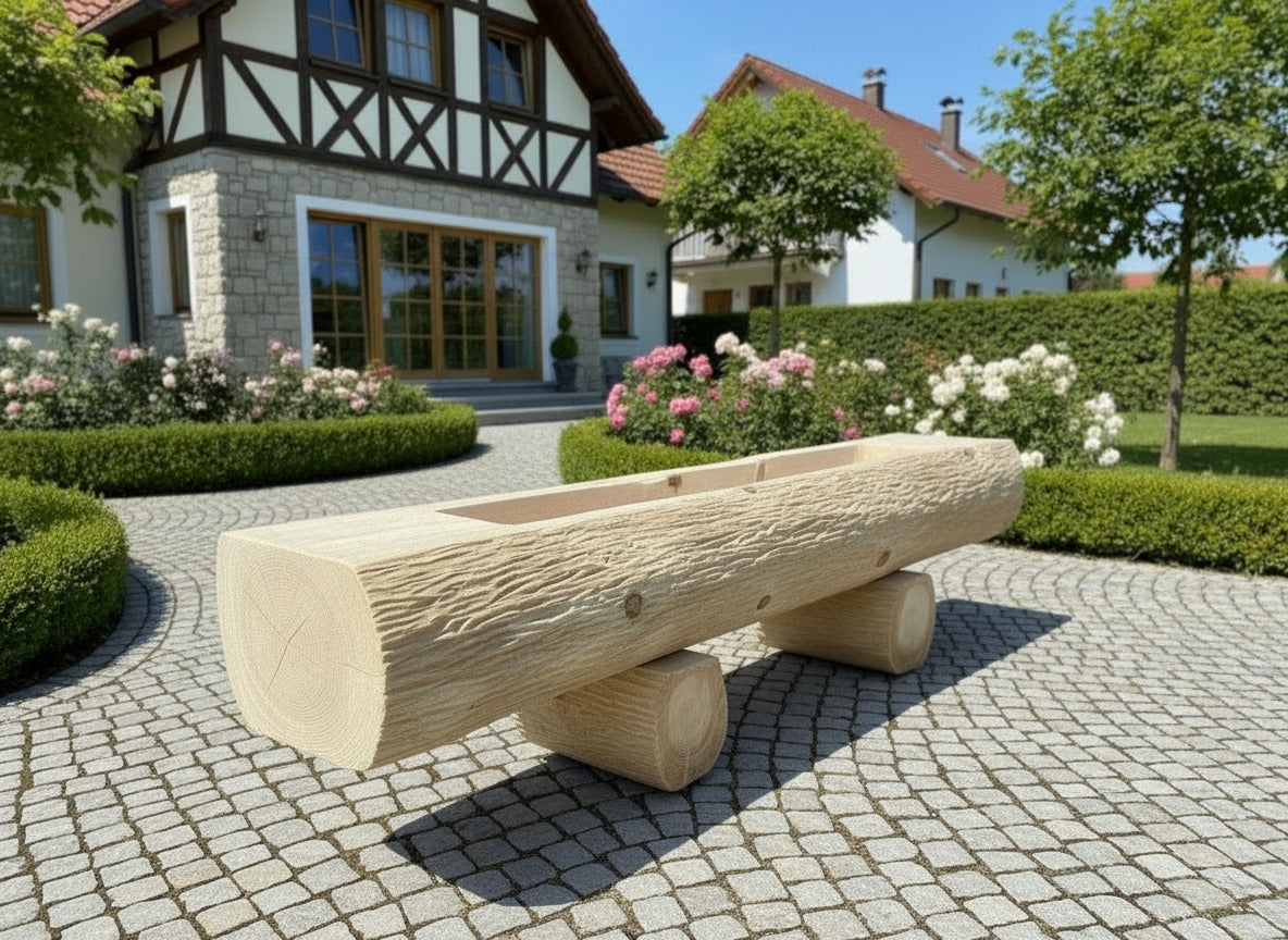 Eleganter Baumstammbrunnen aus massivem Tannenholz mit charakteristischer strukturierter Oberfläche. Die großzügig abgeflachte Oberseite bietet idealen Platz zum Arrangieren von Blumentöpfen und schafft so ein harmonisches Gartenbild. Der herausnehmbare Überlaufstöpsel ermöglicht müheloses Ablassen des Wassers und vereinfacht die Reinigung des Beckens. Ein zeitloses Gestaltungselement, das natürliche Materialität mit praktischer Funktionalität verbindet.