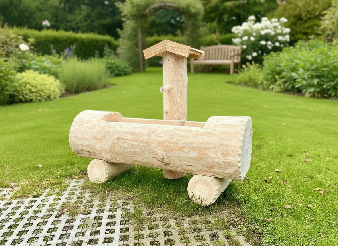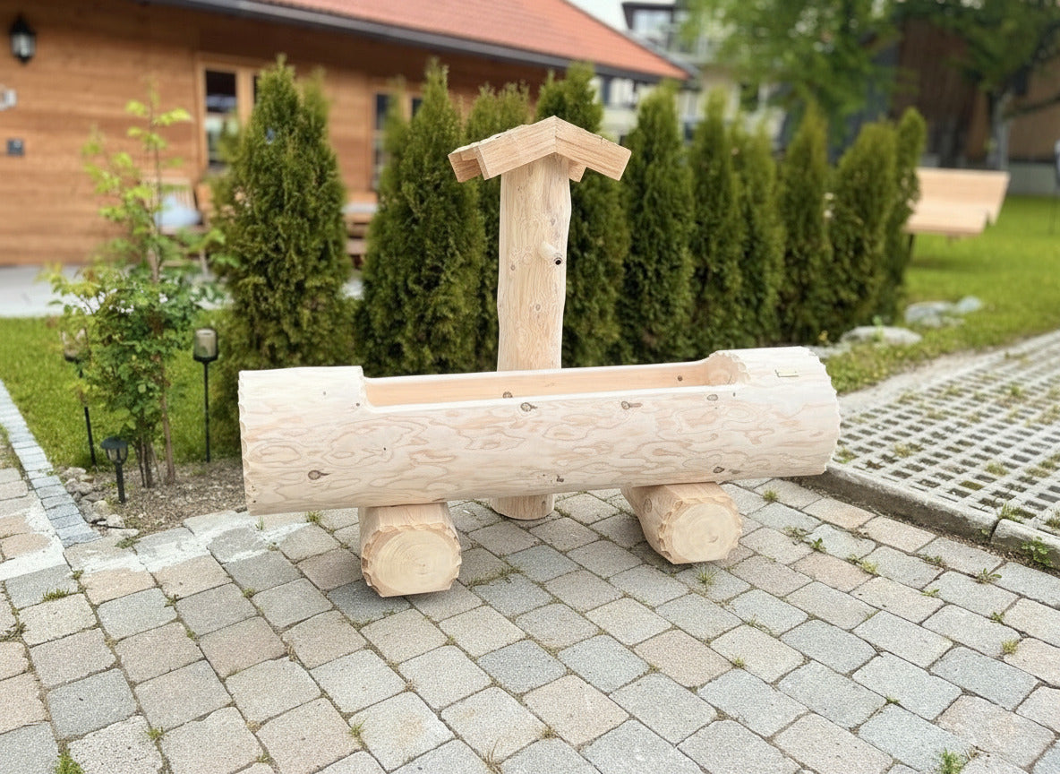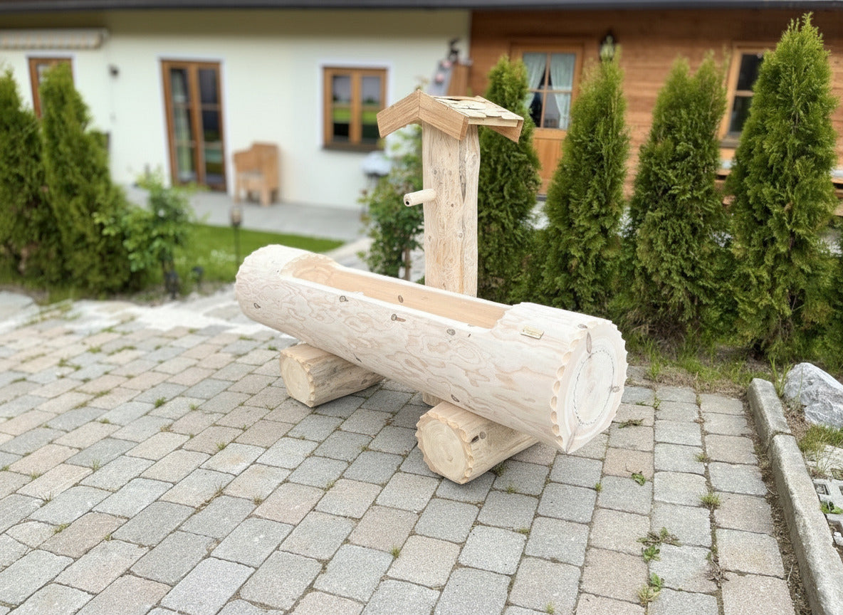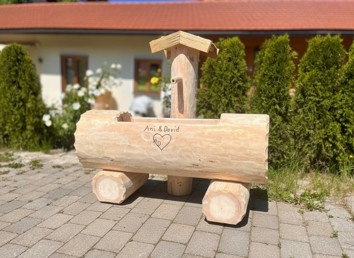 Eleganter Holzbrunnen mit massivem Tannenholztrog und fein geschliffener Oberfläche für samtweiche Haptik. Ein Lärchenholz-Schindeldach schützt die zentrale Säule zuverlässig vor Witterungseinflüssen und verleiht dem Brunnen zeitlose Ausstrahlung. Die rundgeformten Trogkanten bieten ergonomische Griffigkeit und harmonische Ästhetik. Dieses handwerklich gefertigte Gartenelement verbindet traditionelle Konstruktionsprinzipien mit hochwertigen Materialien und eignet sich hervorragend als Blickfang in anspruchsvollen Außenanlagen.