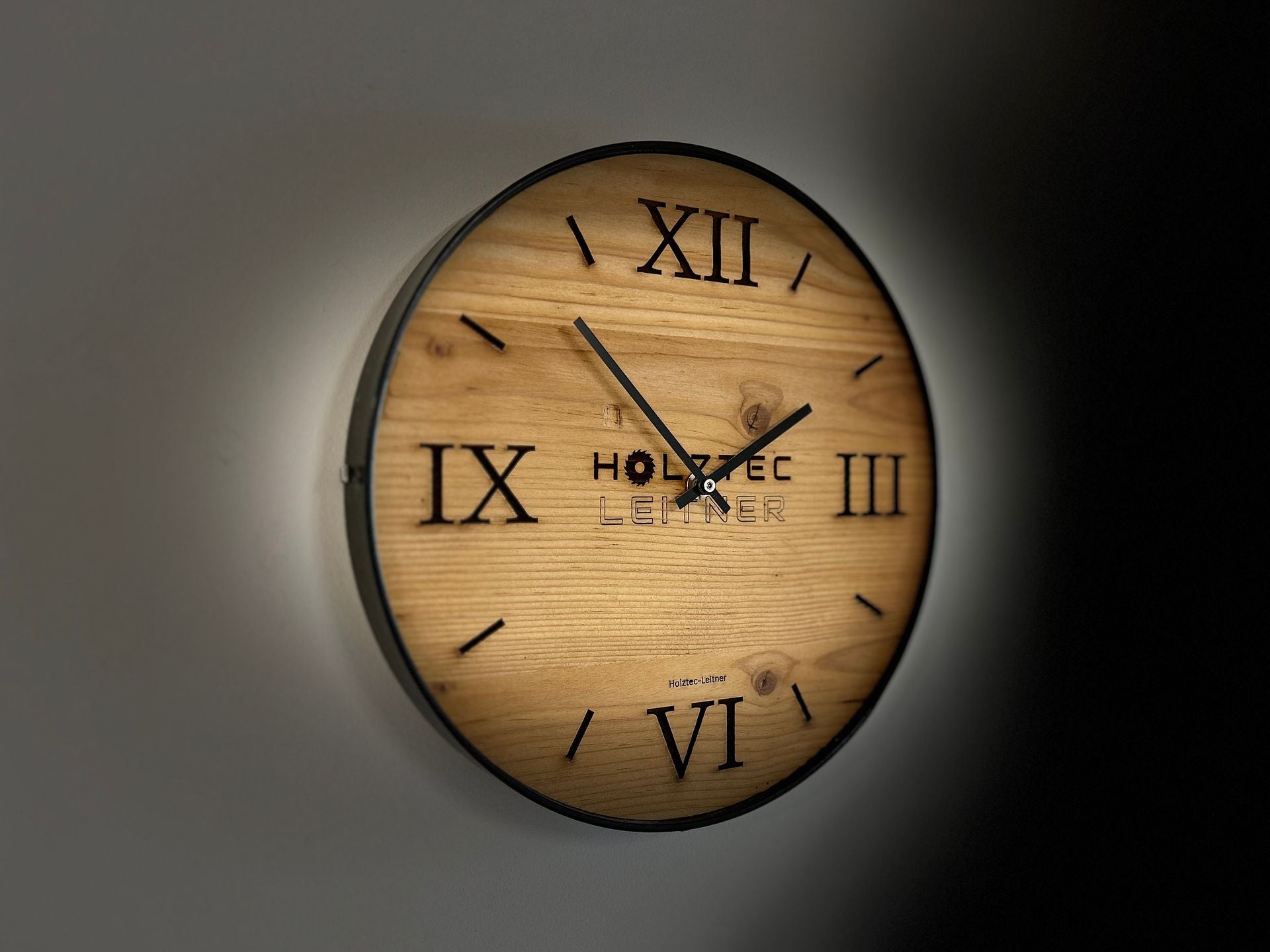 Wanduhr aus Altholz mit eigenem Logo und Metallring