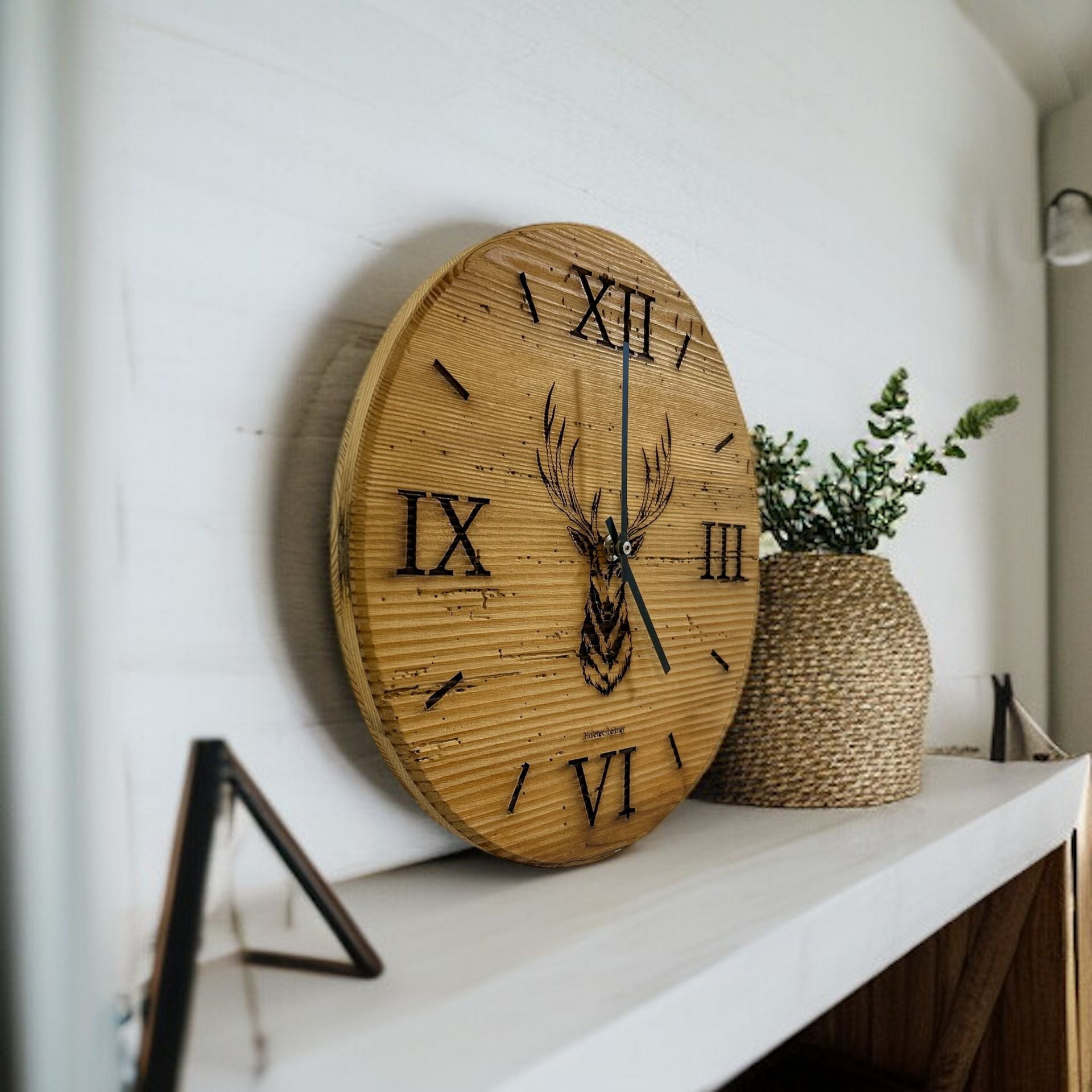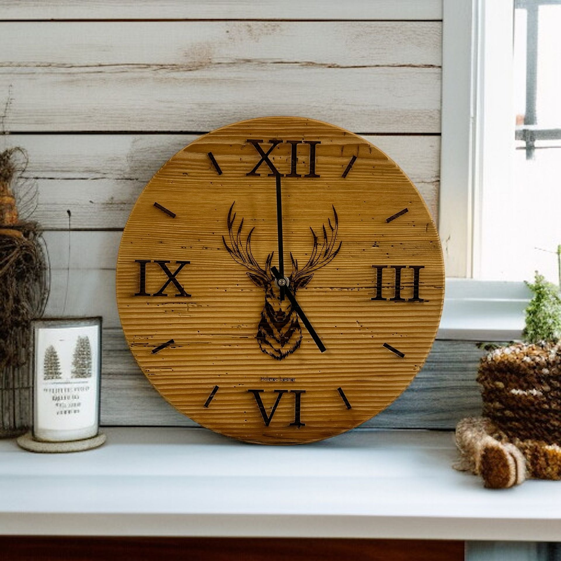 Zeitlose Wanduhr aus authentischem Altholz mit charaktervollem Hirschkopf-Motiv. Das hochwertige Uhrwerk sorgt für zuverlässige Zeitmessung, während die rustikalen Zeiger das natürliche Design perfekt ergänzen. Wählen Sie zwischen 30 cm oder 40 cm Durchmesser – je nach Raumgröße und persönlichem Geschmack. Das Holz verleiht jedem Raum Wärme und Authentizität. Ein Statement-Piece für alle, die Handwerk und Nachhaltigkeit schätzen.