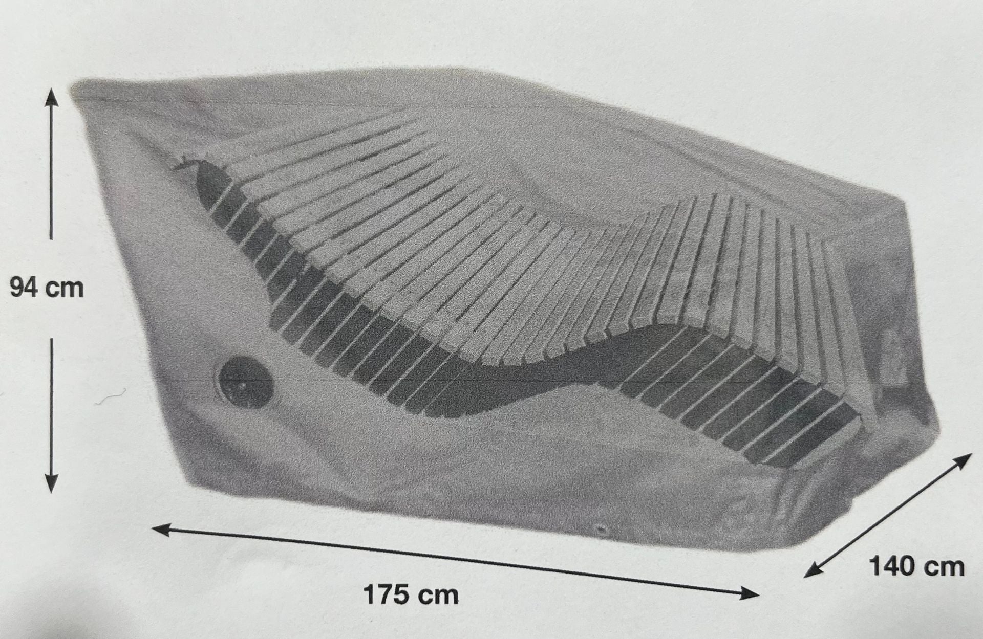 Schützen Sie Ihre Gartenliege zuverlässig vor Witterungseinflüssen mit unserer Premium Abdeckplane. Das robuste Oxford 600D Polyestergewebe mit innenseitiger PVC-Beschichtung und versiegelten Nähten bietet vollständigen Wetterschutz. Seitliche Ventilationsöffnungen verhindern Feuchtigkeitsstau, während die Ösen und Befestigungskordel mit Stopper eine sichere Befestigung gewährleisten. Abmessungen: 175 x 140 x 94 cm, Farbe Lichtgrau.